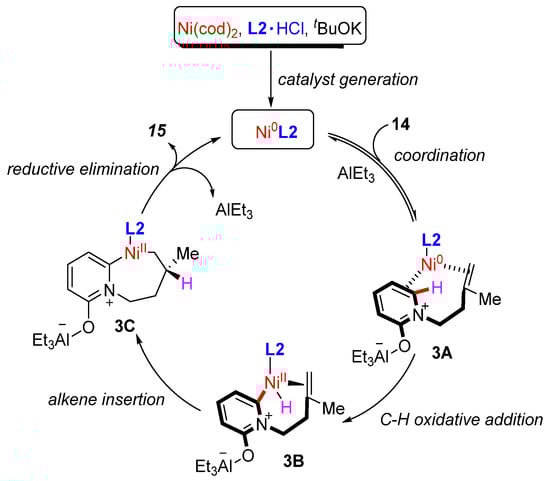 A plausible catalytic cycle is depicted in Scheme 7. It was proposed that this process is initiated by the generation of the L2-Ni(0) catalyst, followed by the Ni/Al dual coordination of substrate 14 to produce the Ni-complex 3A. Next, the C–H bond oxidative addition of the Ni(0) center generates the Ni–H complex 3B. Subsequently, a seven-membered ring intermediate 3C is formed through an anti-Markovnikov alkene insertion. Finally, the reductive elimination of intermediate 3C affords the desired product 15 and regenerates the catalyst for the following cycle.