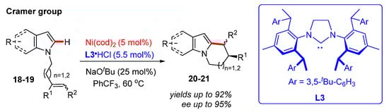 Meanwhile, the Carmer group also reported the Ni(cod)-catalyzed enantioselective C–H functionalization of N-alkenyl-substituted indoles 18 and pyrroles 19 to construct various chiral tetrahydropyridoindoles 20 and tetrahydroindolizines 21 under mild reaction conditions []. It was pointed out that the development of a novel bulky chiral N-heterocyclic carbene hydrochloride L3•HCl is key to the success of this process. Without the essential Lewis acids, including AlMe3, AlEt3, and MAD, both chiral tetrahydropyridoindoles 20 and tetrahydroindolizines 21 were obtained in excellent yields (up to 92% isolated yields) and enantioselectivities (up to 95% ee) (Scheme 8).