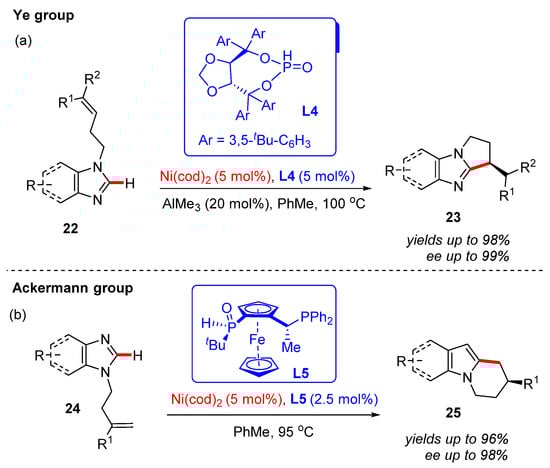In 2018, the Ye group reported the novel enantioselective Ni/Al co-catalyzed intramolecular exo-selective C–H cyclization of N-alkenyl-substituted imidazoles 22 []. By employing a chiral bis(t-butyl)phenyl-containing SPO ligand L4, different kinds of chiral five-membered fused-ring imidazole derivatives 23 were isolated in up to 98% yield and 99% ee (Scheme 9a). In the following year, Ackermann and co-workers also reported a complementary method for the synthesis of chiral six-membered fused-ring imidazole derivatives 25 through an enantioselective Ni(0)-catalyzed C–H functionalization reaction []. In this strategy, the endo-selective C–H cyclization of N-alkenyl-substituted imidazoles 24 was catalyzed by a Ni(cod)2 catalyst and chiral JoSPOphos ligand L5 without additional aluminum reagents, providing the desired products 25 in up to 96% yield and 98% ee (Scheme 9b).