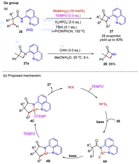 Recently, directing the group-assisted transition metal-catalyzed C–H bond functionalization has become an important approach for constructing C–C and C–heteroatom bonds [,,]. In 2014, Ge and co-workers reported an 8-aminoquinoline (8-AQ)-assisted nickel(II)-catalyzed intramolecular C–H bond dehydrogenative cyclization of aliphatic amides []. The unactivated C(sp3)–H bonds of 2,2-disubstituted propionamides 26 were activated and various kinds of β-lactam derivatives 27 were prepared in good yields (Scheme 10a). As for the substrate scope, a tertiary α-carbon atom was found to be required for this reaction, and a predominant preference for the β-methyl C(sp3)–H bonds over the γ-methyl C(sp3)–H bonds, β-methylene C(sp3)–H bonds, and aromatic C(sp2)–H bonds was observed. Furthermore, benzylic secondary C(sp3)–H bond functionalization has also been achieved via this protocol. In addition, product 27a was easily converted to the desired 3-methyl-3-phenylazetidin-2-one 28 in 66% isolated yield in the presence of CAN and the MeCN-H2O co-solvent.