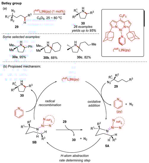 Very recently, the Betley group reported an intramolecular C–H bond amination of aliphatic azides to afford pyrrolidine derivatives, catalyzed by a dipyrrin-supported nickel catalyst [(AdFL)Ni(py)] under mild conditions []. Aliphatic azides 29 containing different sites, including benzylic, tertiary, secondary, and primary C–H bonds, gave rise to the desired pyrrolidines 30 in good yields (Scheme 11a). Furthermore, this reaction also exhibited high chemoselectivity and broad functional group compatibility. It is worth noting that this strategy was used to prepare the indolizidine skeletons—commonly found in many alkaloids—through the sequential cyclization of azide substrates containing ester groups. Furthermore, a possible catalytic cycle is also proposed (Scheme 11b). The initial ligand exchange and subsequent oxidative addition between the substrate 29 and the nickel catalyst [(AdFL)Ni(py)] provides the corresponding nickel iminyl species 5A, pyridine, and nitrogen gas. Next, hydrogen atom abstraction within this intermediate, followed by a radical recombination process, affords the pyrrolidine product 30. Finally, the ligand exchange between pyridine or substrate 29 with the nickel iminyl species 5A facilitates the release of the pyrrolidine product 30.