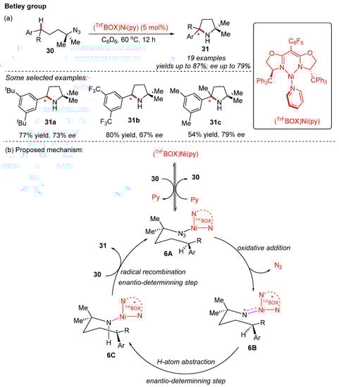 The same group later developed a novel chiral nickel catalyst [(TrFBOX)Ni(py)] to achieve the intramolecular enantioselective C–H amination of aliphatic azides []. Different chiral pyrrolidines 32 were prepared in good yields (up to 87% isolated yields) and moderate enantioselectivities (up to 79% ee) (Scheme 12a). A proposed mechanism is depicted in Scheme 12b. Chiral nickel catalyst [(TrFBOX)Ni(py)] first undergoes ligand exchange with substrate 30 to form the azide intermediate 6A. Nitrogen gas is then released from the azide intermediate 6A to yield the nickel iminyl species 6B. The intramolecular hydrogen atom abstraction of 6B generates the radical intermediate 6C. Finally, the pyrrolidine product 31 is formed through a radical recombination process, aided by the ligand substitution with substrate 30.