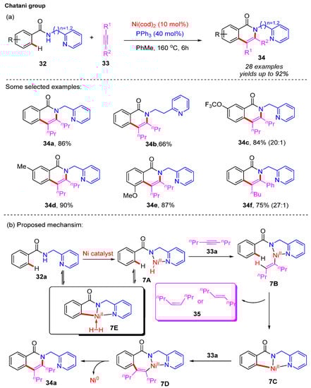 Compared to intramolecular C–H bond functionalization, intermolecular C–H bond functionalization is more challenging. In 2011, Chatani and co-workers reported the first example of a Ni(cod)2-catalyzed directing-group-assisted ortho-C–H functionalization of aromatic amides with alkynes for the construction of isoquinolone derivatives []. Ph3P was used as an essential ligand for stabilizing the nickel catalyst. Initial investigations showed that 2-pyridinylmethylamine was the optimal directing group. In the substrate scope, an array of isoquinolone derivatives were generated in moderate to good yields. Aromatic amides 32c-d bearing the electron-donating groups (Me and OCF3) at the meta-position on the aromatic ring afforded the less-hindered isoquinolone products 34c-d in excellent yields, while aromatic amide 32e with a meta-methoxy group gave the hindered product 34e, which might have been caused by the coordination of an oxygen atom to the nickel catalyst. Furthermore, the unsymmetrical n-butylphenylacetylene could also be converted to the product 34f in good yield (Scheme 13a). A proposed mechanism is depicted in Scheme 13b. First, the coordination of the amide substrate 32a, with the nickel catalyst followed by N–H bond activation, provides the nickel hydride species 7A. The subsequent alkyne insertion of the nickel hydride species 7A produces vinylnickel complex 7B. Next, the ortho-C–H bond cleavage of complex 7B provides the ortho-metalated complex 7C and the corresponding alkynes 35. Finally, the second alkyne insertion and the sequential reductive elimination processes afford the desired isoquinolone product 34a and regenerate the nickel catalyst.