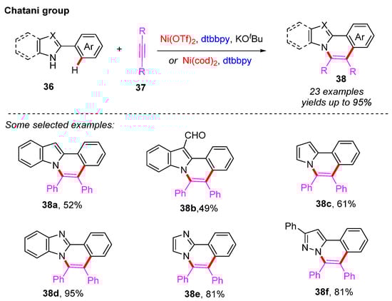 In recent years, C–H functionalization has become one of the most effective approaches to constructing C–C bonds and C–heteroatomic bonds [,,,,,]. This process can convert C–H bonds into the corresponding C–X bonds (X = C, O, N, S, F, Cl, Br, Si, etc.) in a single step. Compared with the traditional organic synthetic strategies, this method can effectively avoid the pre-functionalization of starting materials, reduce the use of chemical reagents, and shorten the count of reaction steps, thus greatly improving the efficiency of the reaction. Within this field, transition metal-catalyzed C–H bond functionalization is an important approach due to its advantages of simplicity, efficiency, and environmental benignity [,]. The uses of Pd, Rh, Ir, and other common noble-metal catalysts have been widely reported with regard to the construction of N-heterocycles through C–H bond functionalization reactions [,,]. In addition, some cheap first-row metal catalysts, including Ni, Cu, Co, Mn, etc., have also been used to realize these processes with success [,,,]. Nickel is located at the top of group VIII in the fourth period of the periodic table. Compared with other transition metal catalysts, nickel catalysts have attracted much attention because of their low cost, widespread availability, and high conversion rates [,]. Furthermore, nickel exists in various oxidation states, giving rise to different redox pathways in different catalytic processes. Due to this unique property, nickel can be used to catalyze cross-coupling, insertion, and cyclization reactions alike [,,]. Hence, nickel is one of the most important transition metal catalysts for the synthesis of N-heterocycles.
