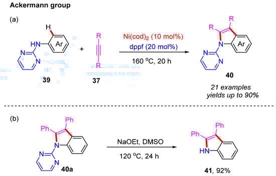 The same group later reported on the development of a new catalytic system for the nickel-catalyzed oxidative C–H/N–H annulation of 2-aryl-pyrrole, benzimidazole, imidazole, indole, and pyrazole derivatives with symmetrical alkynes []. Various kinds of isoquinoline derivatives, including indolo-isoquinolines, pyrrolo-isoquinolines, benzimidazo-isoquinolines, imidazo-isoquinolines, and pyrazolo-isoquinolines, were isolated in good yields (Scheme 14). Furthermore, this strategy exhibits a very board substrate scope and high functional group compatibility. The Ni(0) species is proposed as the key catalytic species in this reaction. It is noteworthy that, theoretically, both the Ni(0) and the Ni(II) catalysts can promote this process. Notably, a strong base is required in the case of the Ni(II) system, whereas no base is needed in the Ni(0) system. In 2013, the Ackermann group presented a Ni(cod)2-catalyzed C–H oxidative annulation of N-arylpyrimidin-2-amines with alkynes []. This novel C–H/N–H bond functionalization strategy afforded a wide array of substituted indoles 40 in good yields (Scheme 15a). In addition, the 2-pyrimidyl group could be easily removed from the substituted indoles 40a to produce the NH-free indoles 41 in 92% isolated yield (Scheme 15b).
