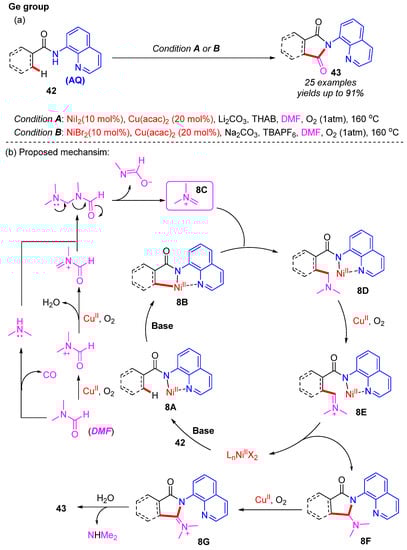 In 2015, the Ge group developed Ni/Cu co-catalyzed 8-aminoquinoline (8-AQ)-assisted direct C–H carbonylation of amides by using DMF as the CO source under an O2 atmosphere []. In this strategy, a variety of aromatic or aliphatic amides were used to construct various isoindoline-1,3-diones and pyrrole-2,5-diones in good yields (Scheme 16a). Furthermore, both the C(sp2)–H and the C(sp3)–H bond functionalization processes have shown broad functional group compatibility and good selectivity. Notably, the quinolin-8-yl moiety could be readily removed by treatment with ammonia to give the NH-free product. Mechanistic studies indicate that the nucleophile is generated by the Ni-catalyzed C–H activation of the amides and that the electrophile results from DMF with the copper species under the O2 atmosphere. A plausible catalytic cycle is proposed in Scheme 16b. The nickel complex 8A is initially formed through the coordination of the amide substrate to the Ni(II) catalyst, followed by a ligand exchange step. The subsequent cyclometallation of the nickel complex 8A generates the intermediate 8B through a C–H bond activation step. Meanwhile, under copper catalysis and the O2 atmosphere, DMF provides the electrophilic species 8C. Then, the intermediate 8D is formed by a nucleophilic addition process, and it is further oxidated to the intermediate 8E at a subsequent step. Finally, the sequential intramolecular nucleophilic addition, oxidation, and hydrolysis of this intermediate afford the desired product 44.
