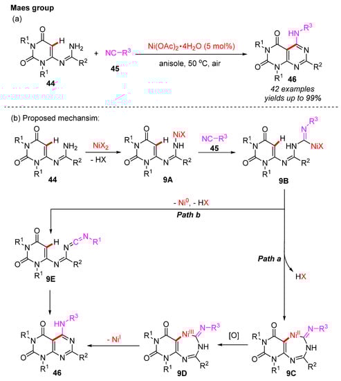In 2020, a Ni(II)-catalyzed oxidative isocyanide insertion/C–H amination reaction was reported by the Maes group. The process proceeded in anisole as a solvent under an air atmosphere at a moderate temperature []. Various N-uracil-amidines and isocyanides were used to construct poly-substituted pyrimidouracils in moderate to excellent yields (Scheme 17a). The N-uracil-amidines bearing different functional groups were well-suited for this reaction. Moreover, a broad range of isocyanides, including primary, secondary, and tertiary aliphatic, benzyl, and aromatic isocyanides were also compatible in this C–H functionalization strategy. As shown in Scheme 17b, a plausible catalytic cycle is proposed. It starts with the formation of the amidine nickel intermediate 9A. The subsequent insertion of the isocyanide 45 yields the amidine nickel intermediate 9B, which is converted to a nickel ring intermediate 9C via C–H bond functionalization. Subsequently, the cyclic Ni(III) intermediate 9D is formed through an oxidative SET process. The sequential reductive elimination gives the product 46 and the Ni(I) species, which eventually undergoes a second SET oxidation to regenerate the active Ni(II) catalyst. Alternatively, the elimination of the β-hydride of intermediate 9B yields the carbodiimide 9E, which is further transformed to the product 46.
