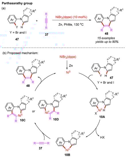 Meanwhile, the Parthasarathy group also presented the nickel-catalyzed C–H annulation of 1-(2-iodophenyl)-1H-pyrrole or 1-(2-bromoaryl)-1H-indole with alkynes []. The Ni/Zn combination of C–H annulations is reported to have constructed different pyrroloquinoline and indoloquinoline derivatives for the first time in good yields (Scheme 18a). In addition, a possible reaction pathway is proposed (Scheme 18b). First of all, the Ni(II) catalyst is reduced by zinc to the active Ni(0) complex. The oxidative addition reaction of substrate 47 to the Ni(0) complex yields the Ni(II) intermediate 10A, which is further transformed to the five-membered nickel intermediate 10B. Then, the alkyne insertion process of this intermediate generates either seven-membered nickel intermediate 10C or 10D. Finally, the reductive elimination of 10C or 10D provides the product 48 and regenerates the active Ni(0) complex.