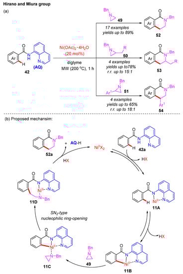 In 2021, the Hirano and Miura group reported a Ni-catalyzed and 8-aminoquinoline (8-AQ)-assisted C–H alkylation of benzamides with alkyl- and aryl-substituted aziridines []. This strategy provides an important complementary approach to preparing benzolactams in moderate to good yields (Scheme 19a). Moreover, 8-aminoquinolinyl, as the directing group, could be spontaneously removed via an intramolecular amidation process. The regioselectivities of the products are determined by the nature of their own substituents. The controlled experiments indicated that an SN2-type nucleophilic ring-opening pathway may be involved in the C–C formation step. The plausible reaction mechanism is depicted in Scheme 19b. The reversible chelation of benzamide 42a with the Ni(II) catalyst generates the nickel complex 11A. Next, the reversible C–H cleavage of the nickel complex 11A provides the intermediate 11B. Subsequently, the coordination of aziridine 49 with the intermediate 11B, followed by an SN2-type nucleophilic ring-opening process, gives the intermediate 11D. The final protonolysis and intramolecular amidation provide the desired product 52a, 8-aminoquinoline (AQ-H), and the Ni(II) catalyst.
