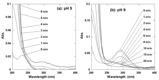 The sonication of 250 µM chlorine aqueous solutions at 600 kHz and 120 W was conducted for pH 5 and 9. The recorded absorption spectrums during the sonolytic runs are plotted in Figure 1a,b. At pH 5, the HClO spectrum increases with time and its intensity becomes more important at higher irradiation times, particularly for λ < λmax = 236 nm. This trend reveals that the sonolysis of HClO may produce species that efficiently absorb UV light in the same band as that of HClO. These species may be characterized by higher molar absorption coefficients (ε) than that of HClO, which allows them to attain higher absorbance values even at lower concentration.