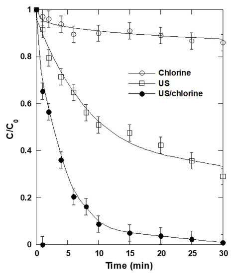 Chlorine is globally the most used chemical oxidant for drinking water disinfection and it led to the formation of trihalomethanes and haloacetic acids. Despite its low activity on microorganisms in biofilms, chlorine can lead to a significant removal of the majority of planktonic bacteria [35]. The combination of ultrasound with chlorine can improve the disinfection process, with the advantage of preventing the formation of disinfection by-products and reducing the chlorine dosage required for achieving admissible disinfection efficiencies [36]. Despite numerous reports of using acoustic cavitation to accelerate wastewater disinfection processes [36,37,38], the application of the US/chlorine system as an oxidation technique for the degradation of organic pollutants is, unexpectedly, very scarce [39]. The US/chlorine technique may present numerous preliminary advantages [39]: