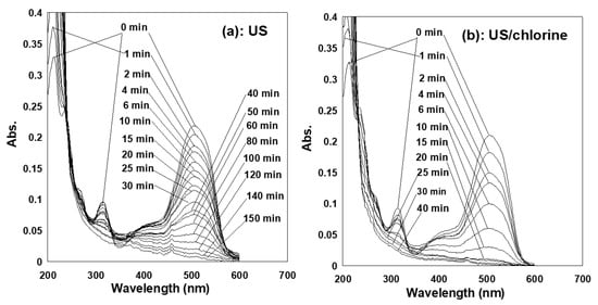 Changes in UV-Vis spectrums during the treatment of ARAC via ultrasound (US) (a) and US/chlorine (b) processes (conditions: C0 = 5 mg·L−1 (10 µM), [chlorine]0 = 250 µM, V = 150 mL, pH 5.5, temperature: 25 ± 1 °C, frequency: 600 kHz, power: 120 W).