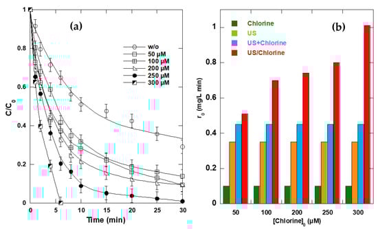 Effect of initial chlorine concentration on the sonochemical degradation of ARAC (a) (conditions: C0 = 5 mg·L−1 (10 µM), [chlorine]0 = 50–300 µM, V = 150 mL, pH 5.5, temperature: 25 ± 1 °C, frequency: 600 kHz, power: 120 W) and variation in initial ARAC removal rate (r0) with respect to [chlorine]0 for chlorination alone, US alone and US/chlorine combination (b) (the sum of the two processes separately, US + chlorine, was added for comparison with the combined process).