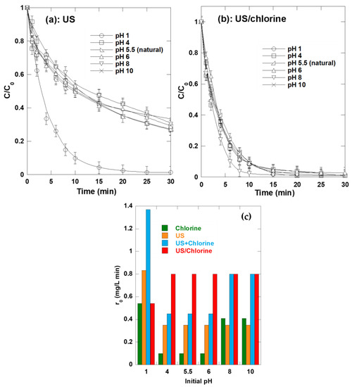Effect of initial solution pH on the performance of US (a) and US/chlorine (b) processes toward the removal kinetics of ARAC (conditions: C0 = 5 mg·L−1 (10 µM), [chlorine]0 = 250 µM, V = 150 mL, pH 1–10, temperature: 25 ± 1 °C, frequency: 600 kHz, power: 120 W) and variation in ARAC initial removal rate (r0) with respect to initial solution pH for chlorination alone, US alone and US/chlorine combination (c) (the sum of the two processes separately, US + chlorine, was added for comparison with the combined process).