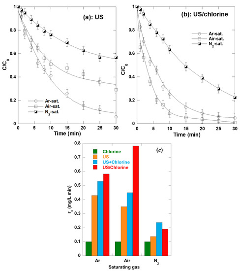 Effect of saturation gases on the performance of US (a) and US/chlorine (b) processes toward the removal kinetics of ARAC (conditions: C0 = 5 mg·L−1 (10 µM), [chlorine]0 = 250 µM, V = 150 mL, pH 5.5, temperature: 25 ± 1 °C, frequency: 600 kHz, power: 120 W) and variation in ARAC initial removal rate (r0) with respect to saturating gas for chlorination alone, US alone and US/chlorine combination (c) (the sum of the two processes separately, US + chlorine, was added for comparison with the combined process).