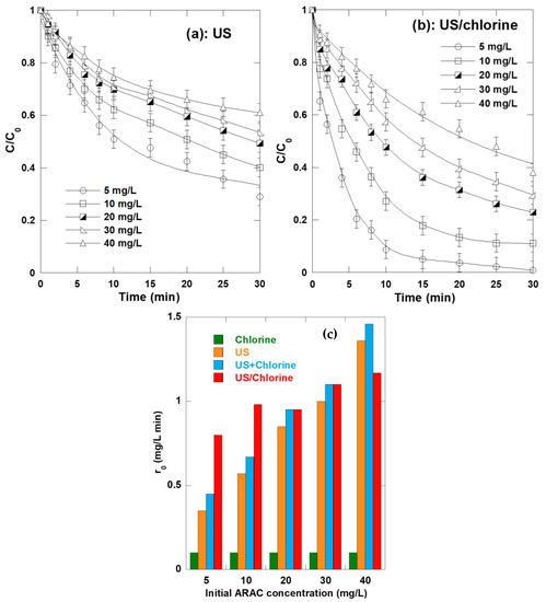 Effect of initial dye concentration on the performance of US (a) and US/chlorine (b) processes toward the removal kinetics of ARAC (conditions: C0 = 5–40 mg·L−1 (10 µM), [chlorine]0 = 250 µM, V = 150 mL, pH 5.5, temperature: 25 ± 1 °C, frequency: 600 kHz, power: 120 W) and variation in ARAC initial removal rate (r0) with respect to initial de concentration for chlorination alone, US alone and US/chlorine combination (c) (the sum of the two processes separately, US + chlorine, was added for comparison with the combined process).