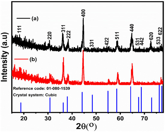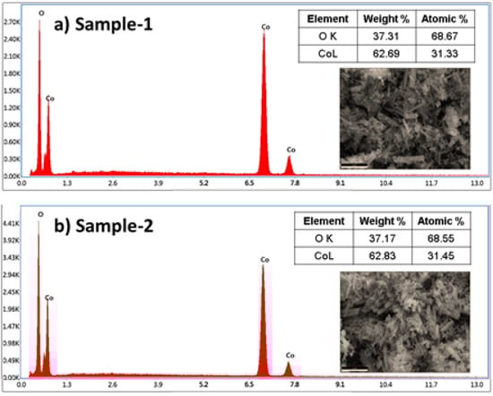The powder XRD was employed to describe the crystallography of nanocrystals of Co3O4 prepared by the hydrothermal method, as shown in Figure 1. The pure sample of Co3O4 is well-characterized by the cubic phase, as shown in Figure 1a, and the diffraction patterns of the sample are well-matched with the standard card no: 01-080-1539. The nanocrystals of Co3O4 prepared in the presence of polyethyleneimine were also studied by the XRD technique, and the observed diffraction patterns are enclosed in Figure 1b. The reflections were slightly shifted towards higher two theta angle which could be assigned to the long chain species of the hydrolyzed product and polyethyleneimine, which might produce stress during the crystal formation. The intensity of XRD diffraction patterns indicates the high quality of the nanocrystals of Co3O4 prepared in this study. The XRD study has not shown any other phase or impurity in the prepared Co3O4. The chemical composition in terms of elements was also studied by EDS, confirming the presence of only Co and O as the main elements in the prepared samples of Co3O4, as shown in Figure 2a,b. The EDS and XRD results reveal the pure phase of the prepared nanostructures of Co3O4.