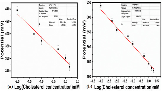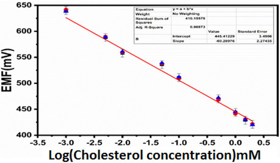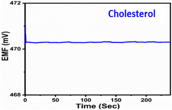 The potentiometric response of each independent electrode was highly reproducible with less than 5% deviation, indicating excellent activity of cholesterol oxidase-immobilized Co3O4 nanocrystals. This study was very vital to fabricate the practical cholesterol-oxidase-immobilized-Co3O4-nanocrystals-based configurations at a large scale. Similarly, the repeatability of the same cholesterol oxidase-immobilized Co3O4 nanocrystals electrode was investigated by conducting the three repeating measurements of cholesterol at alternative days, in terms of linear range and limit of detection, as shown in Figure 7.