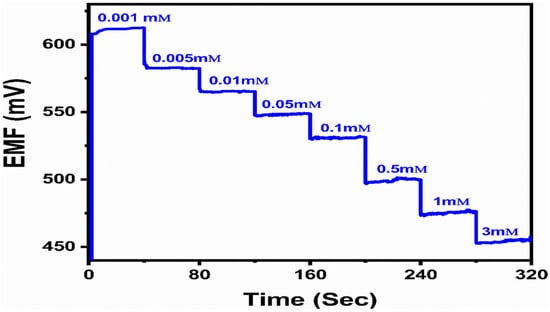 The presented cholesterol biosensor based on cholesterol oxidase-immobilized Co3O4 nanocrystals was evaluated through the potentiometric method in 10 mM phosphate buffer solution of pH 7.3 [34]. The performance of cholesterol oxidase-immobilized Co3O4 nanocrystals was compared with the pristine Co3O4 nanostructures, as shown in Figure 4a,b. It can be seen from Figure 4a that the biosensing performance of cholesterol oxidase-immobilized Co3O4 platelets is poor in terms of accuracy and precision, suggesting a poorly designed analytical device. However, the cholesterol oxidase-immobilized Co3O4 nanocrystals were found highly efficient towards the detection of cholesterol in terms of a wide linear range of 0.005 mM to 3 mM and low limit of detection of 0.001 mM, as shown in Figure 4b. Similarly, the analytical behavior of the proposed method is accurate, as signified by the regression coefficient of 0.99. Additionally, the cholesterol oxidase-immobilized Co3O4 nanocrystals have exhibited a Nernstian response, as confirmed by the sensitivity value of 60 mVdec−1. Furthermore, the successive addition method was used to develop the linear range from 0.001 mM to 3 mM for the cholesterol oxidase-immobilized Co3O4 nanocrystals, as shown in Figure 5.