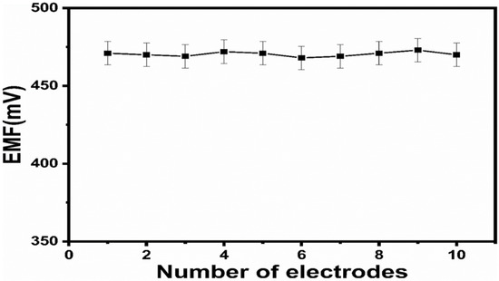 The potentiometric signal of the presented biosensor is attributed to the reaction mechanism described herein which enabled the generation of charged species floating on the surface of cholesterol oxidase-immobilized Co3O4 nanocrystals. The performance of the proposed method is describing the enhanced co-catalytic properties of Co3O4 nanocrystals for the cholesterol oxidase by providing the fast response and direct electron transfer kinetics of different catalytic sites between cholesterol oxidase and Co3O4 nanocrystals. The inter-electrode study of ten cholesterol oxidase-immobilized Co3O4 nanocrystals electrodes was studied in 0.5 mM of cholesterol, as shown in Figure 6.