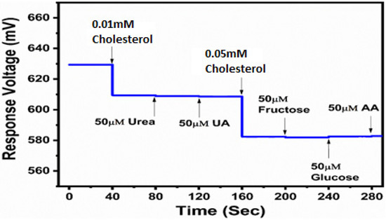 It is clear that a slight variation in the limit of detection was noticed; however, the linear range and sensitivity of that proposed were preserved. The storage life is related to the environmental conditions in addition to the composition of the electrode and effectiveness of enzyme immobilization. In our study, we kept the modified electrode at 4 °C in a phosphate buffer solution after use. The dynamic response of presented cholesterol oxidase-immobilized Co3O4 nanocrystals was also studied in 0.5 mM cholesterol, as shown in Figure 8. The biosensor has shown a fast response time of 1–3 s, suggesting the sensitivity of the cholesterol substrate towards the cholesterol oxidase-immobilized Co3O4 nanocrystals. The selectivity of the present cholesterol biosensor was monitored under the common interfering species, as depicted in Figure 9.