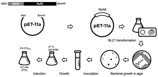 The procedure to obtain the bacterial clone expressing RsAK is depicted in Figure 6. The R. sanguineus nucleotide sequence was obtained from the brown tick’s AK transcript (GenBank: HACP01014757.1) [24] and optimized for recombinant expression in E. coli. A synthetic gene (gBlock, Integrated DNA Technologies (IDT), Coralville, IO, USA) encoding the RsAK amino acid sequence was synthesized for overexpression in E. coli. The gBlock sequence was optimized for expression in bacteria. It included an N-terminal tag of 6 histidine residues and two restriction sites, Nde I at the initial methionine codon and the BamH I restriction after the stop codon. The gBlock was initially cloned into the CloneJET system (Thermo Scientific, Waltham, MA, USA) and later subcloned into a pET11a expression vector (Novagen, Merck, Darmstadt, Germany) using the after-mentioned restriction sites. Cloning was confirmed by Sanger DNA sequencing at the University of Arizona GATC facility (Tucson, AZ, USA). E. coli strain BL21 (DE3) Rosetta II was transformed with 80 ng of the pET11a/RsAK construct. Then, 10 mL of an overnight culture of transformed bacteria was used to inoculate a Fernbach flask with 1 L of LB medium and antibiotics (100 µg/mL of ampicillin and 68 µg/mL of chloramphenicol). The bacteria were grown at 37 °C with an agitation speed of 225 rpm until they reached an A600 of 0.6. Isopropyl thiogalactopyranoside (IPTG) was added as an inducer to a final concentration of 0.2 mM. Bacteria were cultured for 18 h at 25 °C and harvested by centrifugation at 4500× g for 15 min.