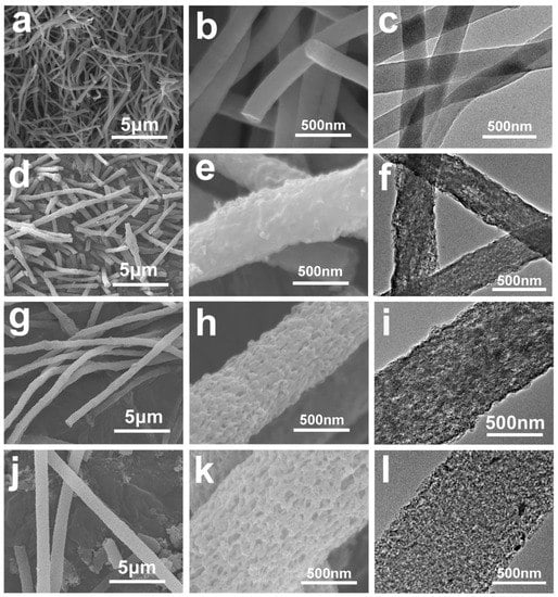 FESEM images (a,b,d,e,g,h,j,k) and TEM images of different carbon fibers. (a–c) CPAN, (d–f) NPCF-1, (g–i) NPCF-2, (j–l) NPCF-3.