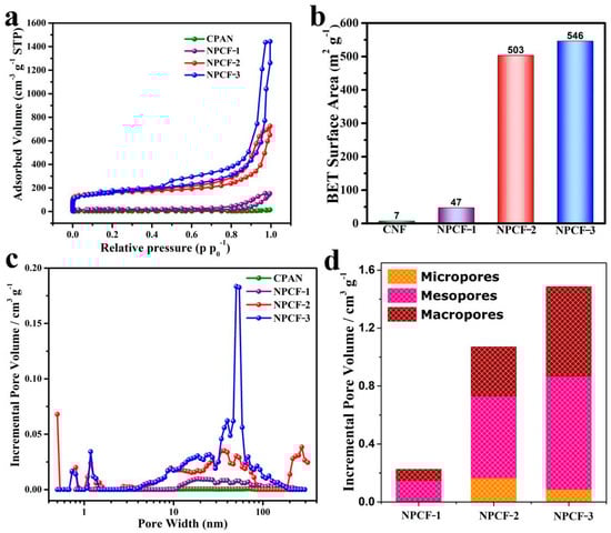 To further explore the pore structure of different carbon fibers, they were examined with nitrogen adsorption-desorption analysis. The isotherms (Figure 2a) show that the NPCF-2 and NPCF-3 possess much higher pore volume than that of CPAN and NPCF-1 so the specific surface area of NPCF-2 (503 m2 g−1) and NPCF-3 (546 m2 g−1) are much higher than that of CPAN (7 m2 g−1) and NPCF-1 (47 m2 g−1) (Figure 2b). The pore size distribution based on the density functional theory (DFT) model (Figure 2c,d) indicates that the NPCF-3 possesses more mesopores (30–50 nm) and macropores (50–200) than the other two NPCFs. It is interesting that the NPCF-2 possesses more micropores than NPCF-3 so that it has a similar specific surface area to NPCF-3 although its total pore volume is less than that of NPCF-3.