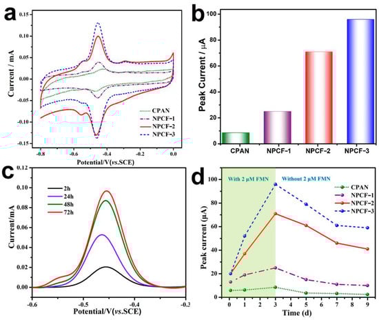 The electrochemical behavior of different NPCF anodes was firstly investigated in flavin mononucleotide (FMN) solution to understand the interfacial redox reactions of flavin mediators on these porous carbon fibers. As shown in Figure 3a, all three NPCFs exhibit a good redox pair at around −0.45 V vs. SCE, which is attributed to the redox reaction of FMN. It is noted that the peak height values are proportional to the pore volume (especially to the volume of mesopores and macropores) rather than the specific surface area of the porous carbon fibers. The reason might be that the micropores are not suitable for FMN reaction 3 but contribute a lot to the specific surface area. In addition, the redox peaks increase continuously during the first 72 h in the FMN solution (Figure 3c), which suggests a slow adsorption process. To evaluate the adsorption behavior of different carbon fiber electrodes, a time-dependent oxidative peak variation profile (at an interval of 24 h) was investigated and recorded as shown in Figure 3d. For all electrodes, the redox peak reaches the maximum level at 72 h. After that, the anodes were transferred into the phosphate buffer without FMN, the decrease in the peak current could be observed due to the slow desorption of the FMN from the electrode surface. However, unlike the CPAN and NPCF-1, the NPCF-2 and NPCF-3 remain around 50% of peak height. It suggests that a large number of nanopores of these two carbon fiber electrodes promote the adsorption of FMN on the electrode surface and the adsorbed amount of FMN seems proportional to the pore volume. According to these results, the NPCF-2 and NPCF-3 electrodes could provide higher concentrations of interfacial flavin mediators for the interfacial electron transfer between the bacteria and the electrode and may deliver much higher performance in the MFCs operation than the other two anodes.