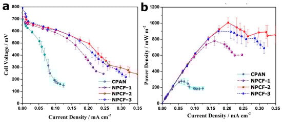 To evaluate the bio-electrochemical catalysis performance of different carbon fiber anodes, they were applied in S. putrefaciens CN32-catalyzed MFCs with batch-type dual-chamber configuration. The power curves and the polarization curves are shown in Figure 4. It is noted that the NPCF-2 anode delivers a maximum power density of 997 mW m−2, which is three-fold higher than that of the CPAN anode (277 mW m−2) and ten-fold higher than that of the carbon cloth anode (101 mW m−2, Table S1). Surprisingly, the NPCF-3 anode did not exhibit outstanding power output performance (903 mW m−2) although it possesses the highest total pore volume and specific surface area. According to Figure 3a, the NPCF-2 anode possesses a higher double-layer capacitance current, which will significantly contribute to the power density [,]. That might be one reason for its superior performance in power output evaluation.