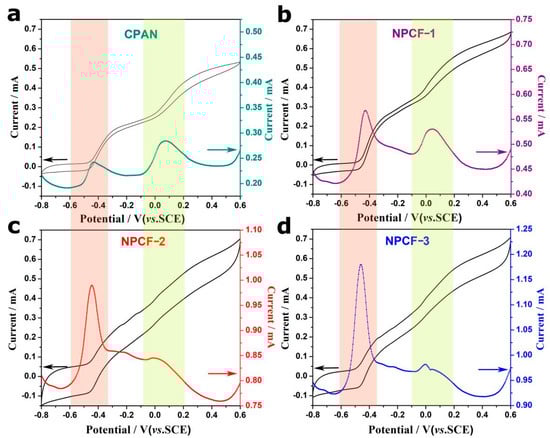 According to methods previously reported [,], different amounts of ZIF-8 (0.0875, 0.175, and 0.35 g) nanoparticles were added into 2.185 mL N, N-dimethylformamide (DMF) with sonication until it was well dispersed. Then, 0.175 g of ground polyacrylonitrile (PAN) powder was added to the former solution with stirring for around 30 h to form a homogeneously dispersed spinning solution. A 5 mL syringe capped with a flat metallic needle was filled with the spinning solution and mounted on an automatic syringe pump (Pump 11 Elite, Harvard, Holliston, MA, USA). The fibers were obtained by electrospinning with a positive voltage of 20 KV, a collecting distance of 18 cm, and an injection speed of 1.0 mL h−1 at 28 °C. After peroxidation at 280 °C for 2 h with a ramp rate of 1 °C min−1, the fibers were carbonized under the protection of high purity argon gas through a two-stage heating process. In particular, the materials were carbonized at 550 °C for 1 h with a ramping rate of 2 °C min−1, followed by a further pyrolysis process at 900 °C for 2 h with a ramping rate of 5 °C min−1. The resultant composite nanofibers were soaked in sulfuric acid (3 M) under magnetic stirring for 3 h at room temperature, washed with ethanol, and deionized water several times. The final product was obtained by freeze-drying and stored under ambient conditions for the following experiments. The products synthesized with 0.0875, 0.175 and 0.35 g ZIF-8 were denoted as NPCF-1, NPCF-2 and NPCF-3, respectively. CPAN fibers synthesized without ZIF-8 were also treated with the same procedures as described above.