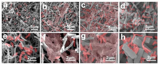 FESEM images of the bacterial cells adhered to the electrode surface after 14 days MFCs operation. (a,e) CPAN, (b,f) NPCF-1, (c,g) NPCF-2 and (d,h) NPCF-3.