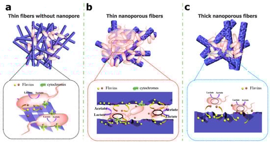According to the above discussions, the fiber diameter and internal nanoporous dependant interfacial electron transfer behavior between the nanoporous carbon fiber anode and the S. putrefaciens CN32 cells could be summarized in Figure 7. For the thinner fibers without internal nanopores (a), the DET could be achieved but the bacteria cell loading amount is not enough to achieve a high catalytic current. Further, they cannot provide enough surface for fast IET due to the lack of porous structure. For the carbon fiber anode with appropriate fiber diameter and internal nanopores (b), the bacteria cells can form a continuous biofilm with EPS structure on the fiber surface for DET. Beneath the biofilm, the mesopores promote the adsorption of the flavins and provide a large active surface area for fast IET. As a result, this kind of mesoporous carbon fiber anode could achieve superior power generation performance via an outstanding interfacial electron transfer process. For the quite thick mesoporous carbon fiber anode (c), the large interspace impedes the formation of tightly adhered continuous biofilm so that the DET process is limited. According to this mechanism, it is important to control the fiber diameter and the interspace besides the mesopores tailoring when designing the porous fiber electrode for optimal bioelectrocatalysis.