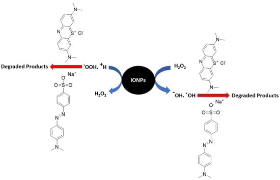 IONPs are effective photocatalysts absorbing visible light. TiO2, a frequently used photocatalyst due to its broad band-gap of 3.2 eV, absorbs UV light with wavelengths of 380 nm (covering just 5% of the solar spectrum). While Fe2O3, an intriguing n-type semiconducting material with a band-gap of 2.2 eV, is a good candidate for photodegradation under visible light conditions, making IONPs more effective than TiO2 [15]. IONPs superior photocatalytic performance over TiO2 can be due to the significant production of electron-hole pairs caused by the narrow band-gap irradiation [16]. Due to their enhanced photocatalytic action, various Fe (III) oxide species, including Fe2O3 and -FeOOH, have been proposed to degrade organic pollutants and lessen their toxicity [17]. IONPs can even be used for the adsorption of dyes [18]. IONPs are one of the potential materials for photocatalytic application [19] due to their narrow band gap [20], chemical stability, high surface area and absorbing light up to 600 nm, and effective electrons excitation of FeO from the valence band to the conduction band [21]. IONPs can act in Fenton processes as precursors of Fe ions and as photocatalysts under visible light since they have a lower band gap (2.2 eV) [22]. Hence, IONPs can be used as Fenton-like oxidants for degrading dyes like methylene blue and methyl orange (Figure 1). The photocatalytic degradation of dyes makes nanoparticles effective for bio-remediate use.