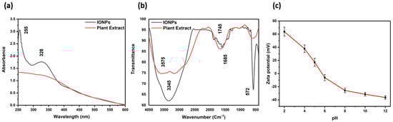 (a) UV–Vis spectrum of synthesized IONPs and plant extract, (b) FTIR spectra of synthesized IONPs and plant extract, and (c) Graph illustrating zeta potential vs. pH of biosynthesized IONPs.