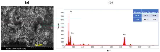 FE-SEM provided further insight into the morphology and size details of the IONPs. The morphology of the synthesized nanoparticle is shown in Figure 3a. The figure shows that the as-synthesized nanoparticles are not uniform and, in some cases, agglomerated. The large agglomerated clusters were formed due to the accumulation of tiny building blocks of various bioactive reducing agents in plant extract or as a result of the plant extract’s lower capping ability and the agglomeration tendency of the iron-based nanoparticles due to magnetic interactions. The elemental composition of the sample was analyzed by EDX analysis. The EDX analysis in Figure 3b clearly shows the presence of the K-α at 6.4 keV due to Fe atoms present in the nanoparticle and K-α lines at 0.6 keV from O atoms. Similar results were also obtained by another study [39]. Other tiny peaks, such as K-α 0.25 keV, are due to adventitious carbon and oxygen that are commonly observed even without sample loading [40]. The percentage of weight present under the irradiated areas was 34.8% and 65.2% for oxygen, and iron, respectively.