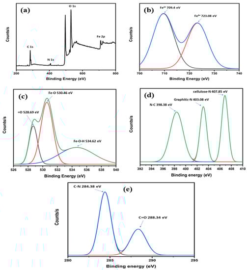 (a) XPS spectrum of biosynthesized IONPs, (b) Fe 2p spectra, (c) O 1s spectra, (d) N 1s spectra, and (e) C 1s spectra.