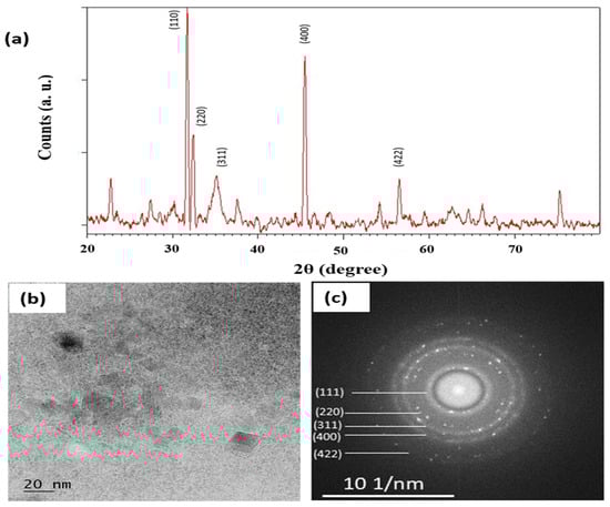 Figure 5b depicts a TEM image of the synthesized IONPs. The grain size distribution was determined by taking the mean diameter of about 100 particles on the nano-graph. HR-TEM indicates the average grain size of nanoparticles to be 12.64 nm. The nanoparticles are almost cubic and partly spherical, which agrees with the above XRD analysis. Moreover, the selected area electron diffraction (SAED) pattern (Figure 5c) recorded from an area containing numerous nanoparticles reflects cubic crystallinity indexed as (111), (220), (311), (400), and (422), which is in agreement with XRD result as well. The given particle size obtained from the TEM analysis could be due to the nanoparticle’s wide size distribution.