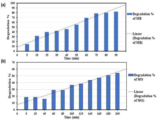 (a) Graphical representation of degradation of methylene blue and (b) Graphical representation of degradation of methyl orange.