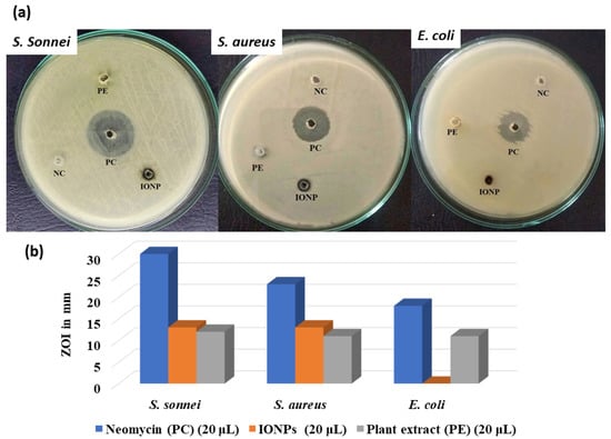 The anti-bacterial activity of IONPs was studied using the diffuse disc method against Gram-positive (Staphylococcus aureus) and Gram-negative bacteria (Shigella sonnei and Escherichia coli). The biosynthesized IONPs showed better anti-bacterial activity (based on the zone of inhibition) against Staphylococcus aureus and Shigella sonnei (Figure 7a). When comparing Shigella sonnei and Staphylococcus aureus, IONPs showed equal anti-bacterial activity, i.e., ZOI of 13 mm. However, in the case of E. coli, IONPs did not show anti-bacterial activity (Table S5) (Figure 7b). These findings agree with results reported elsewhere [52,53,54].