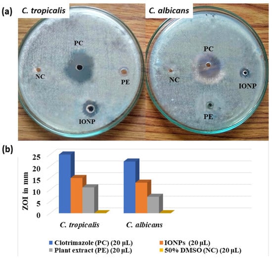 The anti-fungal activity of IONPs was studied using the Agar Well Disc Diffusion method against Candida tropicalis and Candida albicans. The biosynthesized IONPs showed anti-fungal activity (based on the zone of inhibition) against C. tropicalis than C. albicans (Figure 8a). When comparing C. tropicalis and C. albicans, IONPs showed more anti-fungal activity, i.e., ZOI of 15 mm in the case of C. tropicalis, whereas, for C. albicans, it showed ZOI of 13 mm (Table S6) (Figure 8b). These findings hold good agreement with results published elsewhere [55,56]. Previous research has identified two possible mechanisms for the interaction of nanoparticles with bacteria and fungi. One of them is the increased production of reactive oxygen species (ROS), such as hydroxyl radical’s percent (OH−), singlet oxygen (O2*), and hydrogen peroxide (H2O2) [57]. Electron-hole pairs are formed when IONPs with defects are activated by UV or visible light. The holes can split H2O molecules into OH− and H+. Electron addition converts dissolved oxygen molecules to superoxide radical anions (O2). The free radicals O2− and OH− produced in the reactions can depolymerize polysaccharides, cause DNA strand breaks, initiate lipid peroxidation, and inactivate enzymes, leading to cell death [54]. Another plausible mechanism is nanoparticle binding to cell membrane proteins via electrostatic interactions, or nanoparticle accumulation in the cytoplasm or periplasmic region, disrupting cellular function and membrane disruption and disorganization [54].