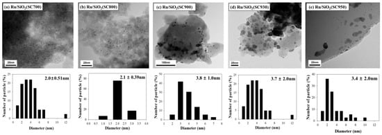 To measure the particle size of Ru metal in the Ru/SiO2 catalysts, TEM images were obtained for Ru/SiO2(C) and Ru/SiO2(SC) catalysts after reduction with H2 at 350 °C. The average Ru particle size can be calculated for Ru/SiO2(C) catalysts, which have relatively well-dispersed Ru nanoparticles. The average particle size of Ru metal in Ru/SiO2(C100), Ru/SiO2(C300), Ru/SiO2(C500), and Ru/SiO2(C700) were determined as 2.3 ± 0.72, 6.0 ± 1.9, 5.4 ± 1.4, and 5.6 ± 2.2 nm, respectively (Figure 1 and Table 1). Ru/SiO2(SC700) and Ru/SiO2(SC800) also have well-dispersed Ru nanoparticles, and their average sizes were 2.0 ± 0.51 and 2.1 ± 0.39, respectively (Figure 2 and Table 1). On the other hand, Ru catalysts supported on SiO2 calcined at temperatures higher than 800 °C possess irregular, extremely large Ru agglomerates. Therefore, the average particle size of Ru metal could not be estimated for Ru/SiO2(SC900), Ru/SiO2(SC930), and Ru/SiO2(SC950). However, they still had some Ru nanoparticles, and their average particle sizes were calculated to be 3.8 ± 1.0, 3.7 ± 2.0, and 3.4 ± 2.0, respectively (Figure 2 and Table 1). These results imply that the SiO2 support with a small surface area is not beneficial for obtaining well-dispersed Ru nanoparticles. However, it can be said that the oxidation of Ru catalysts supported on SiO2 with a large surface area has the potential to increase the Ru particle size to a certain degree without severe agglomeration. It is worth mentioning that large, irregular Ru lumps were observed even in the 1 wt.% Ru/SiO2(SC900) with a BET surface area of 102 m2/g. More Ru lumps with extremely large sizes can be found in the Ru/SiO2 catalysts with smaller BET surface areas than in Ru/SiO2(SC900). Note that relatively well-dispersed Ru nanoparticles with an average Ru particle size of approximately 6 nm were obtained for Ru/SiO2 catalysts calcined at 300, 500, and 700 °C. This was related to the high surface area of the SiO2 support.