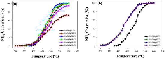 The catalytic activity for ammonia decomposition was evaluated for Ru/SiO2 catalysts. Ammonia conversion as a function of the reaction temperature over different catalysts is shown in Figure 3. In the case of the Ru/SiO2(SC) catalysts (Figure 3a), Ru/SiO2(SC700), Ru/SiO2(SC800), and Ru/SiO2(SC900) showed similar ammonia conversions with Ru/SiO2(C100) at the same temperature. This can be attributed to the similar Ru particle sizes of Ru/SiO2(SC700), Ru/SiO2(SC800), and Ru/SiO2(C100). Notably, Ru/SiO2(SC900) had both Ru nanoparticles with an average particle size of 3.8 nm and large Ru lumps. Ru/SiO2(SC930) had similar catalytic activity with Ru/SiO2(C100) at low temperatures but became inferior to Ru/SiO2(C100) at high temperatures. Note that Ru/SiO2(SC950) was also vastly inferior to Ru/SiO2(C100) at 450 °C and higher. As these catalysts have both Ru nanoparticles and extremely large Ru lumps, it was difficult to establish any correlation between the catalytic activity and Ru particle size. However, it was clear that extremely large Ru agglomerates, which can easily form on a SiO2 support with a small surface area, are not plausible for ammonia decomposition.
