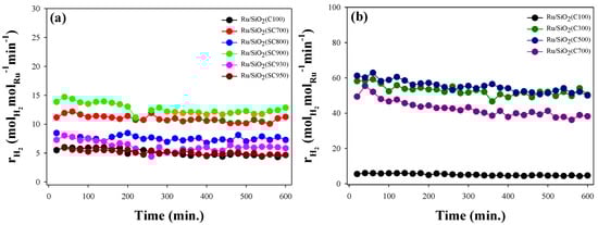 The H2 formation rates based on the amount of Ru metal were obtained at 400 °C over Ru/SiO2(C) and Ru/SiO2(SC) catalysts. Figure 4a shows that the initial catalytic activities were maintained over all the Ru/SiO2(SC) catalysts, and their rates decreased in the following order: Ru/SiO2(SC900) > Ru/SiO2(SC700) > Ru/SiO2(SC800) > Ru/SiO2(SC930) > Ru/SiO2(SC950)~Ru/SiO2(C100). The H2 formation rates over the Ru/SiO2(C) catalysts decreased in the following order: Ru/SiO2(C500)~Ru/SiO2(C300) > Ru/SiO2(C700) >> Ru/SiO2(C100). Note that the H2 formation rates decreased slowly with time on stream over Ru/SiO2(C300), Ru/SiO2(500), and Ru/SiO2(700), even though their H2 formation rates were much higher than that of Ru/SiO2(C100).