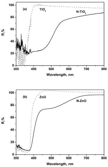 Table 1 reports the specific surface area (SSA) obtained by the BET method for the prepared samples. The SSA of TiO2 slightly decreases from 50 m2·g−1 to 45 m2·g−1 after doping with nitrogen. The SSA value of ZnO and N-ZnO was equal to 5 m2·g−1 and 2 m2·g−1, respectively. Such results are in agreement with the available literature [40,41].