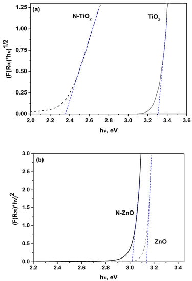 The reflectance spectra of TiO2 and N-TiO2 (Figure 1a) essentially differ in terms of the broad absorption in the visible region located in the blue region of electromagnetic radiation (430–480 nm), determining a significant decrease in band-gap values from 3.3 eV (the typical band gap of commercial undoped TiO2) to 2.35 eV (Figure 2a and Table 1), which is an unexpected value for bare TiO2 in the anatase phase. The intensity and width of this absorption depend on the preparation method used for synthesis, as reported by di Valentin et al. [17]. Nevertheless, the spectrum of N-TiO2 is very close to that reported by other authors who synthetized N-doped TiO2 with different methods [22,23]. On the other hand, the optical absorbance behavior of N-ZnO changed slightly with respect to the commercial sample, indicating that doping alters the optical behavior of N-ZnO to a lesser extent than doping of TiO2 with nitrogen. A small decrease in band-gap energy of N-ZnO (3.0 eV) was observed with respect to commercial undoped ZnO (3.15 eV) (Figure 2b and Table 1), suggesting that the energetic intermediate levels generated between the conduction and valence bands of ZnO do not drastically change the band gap value [24].