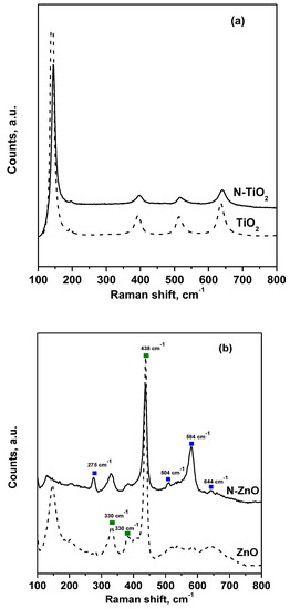 Raman spectroscopic analysis was employed to examine the possible variations in Raman active vibrational modes of TiO2 and ZnO due to the presence N into the host lattice (Figure 3). For both TiO2 and N-TiO2 samples (Figure 3a), all the signals can be assigned to the Raman active modes of the anatase crystal phase [25,26]. Moreover, a slight blue shift of the Raman active mode (Eg(1)) was observed from 144 to 146 cm−1 for the doped sample, clearly indicating the presence of a nonstoichiometric TiO2−x phase [27,28]. For both ZnO and N-ZnO spectra (Figure 3b), a prominent peak was detected at 438 cm−1, which was associated with the Raman-active dominant mode (E2(H)) of wurtzite ZnO [29]. Furthermore, two less intense Raman bands were observed at 330 and 378 cm−1 and assigned to E2(H)–E2(L) (multi-phonon) and A1 (TO) modes of wurtzite ZnO, respectively [30]. The N-ZnO sample showed three additional broad and weak signals at 275, 504, and 644 cm−1 [31]. It has been argued that the presence of these Raman signals is associated with the presence of nitrogen in the ZnO crystalline framework [31,32]. For the N-ZnO sample, the intensity of the Raman band at 580 cm−1 was stronger than that of the commercial ZnO. According to the available literature on doped ZnO photocatalysts [33,34,35], such a band is due to the presence of oxygen vacancies, the presence of which is increased by the introduction of the dopant element into the ZnO lattice, affecting the stoichiometry of the host semiconductor.