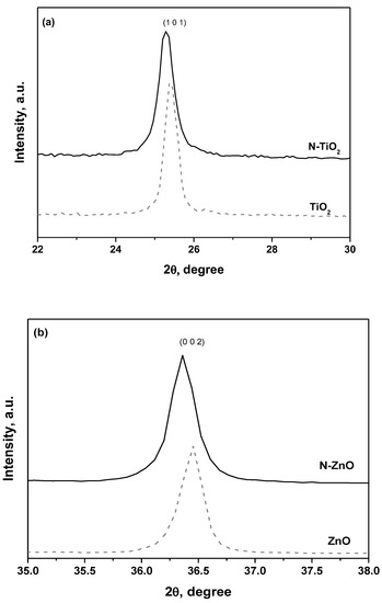 WAXD patterns of all photocatalysts were also examined in the 2θ range of 22–30° for TiO2 and N-TiO2 and in the 2θ range of 35–38° for ZnO and N-ZnO (Figure 5).