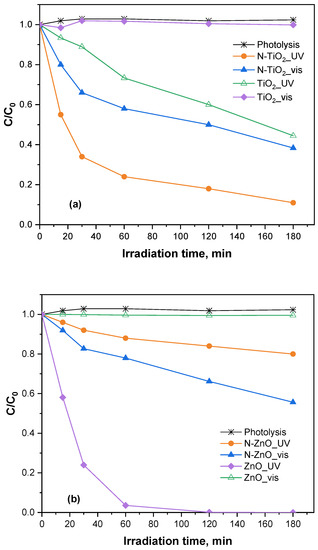 Figure 6 shows the photocatalytic performances of all the samples toward EBT dye degradation under UV and visible light for TiO2-based photocatalysts (Figure 6a) and ZnO-based photocatalysts (Figure 6b). It is important to note that the photolysis of EBT dye can be negligible under both irradiation conditions [42]. According to the curve decay observed in terms of EBT relative concentration, commercial TiO2 and ZnO are active only under UV irradiation, reaching 56 and 100% EBT discoloration, respectively, after 180 min of irradiation time (Figure 6a,b). The photocatalytic performances of commercial TiO2 and ZnO are extensively discussed and compared in the literature, clearly reporting that ZnO is more active than TiO2 in the degradation of azo dyes using UV or sunlight as the excitation source [43]. It has been argued that the higher photocatalytic activity of ZnO relative to that of TiO2 under UV light may be associated with the increased efficiency of generation and separation of photoinduced electrons and holes [44]. In particular, some authors argued that the intrinsic defects in ZnO crystal lattice are able to effectively trap the charge carriers [45,46]. In particular, Zn interstitials and oxygen vacancies (both positively charged) can enhance the photo-induced redox reactions on ZnO by trapping photo-generated electrons, therefore limiting the recombination phenomena among electrons and holes [47]. Different behavior under UV light was observed when nitrogen was inserted in the crystalline structure of both TiO2 (Figure 6a) and ZnO (Figure 6b).