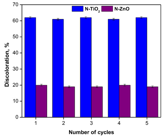 N-TiO2 and N-ZnO photocatalysts were used for recycling experiments based on the results reported in Figure 6. Figure 7 shows five cycles of EBT photodegradation with the same sample (without any regeneration step) under visible light irradiation. The EBT discoloration of neither N-TiO2 nor N-ZnO changed considerably for all the cycles, evidencing good stability of both photocatalysts.